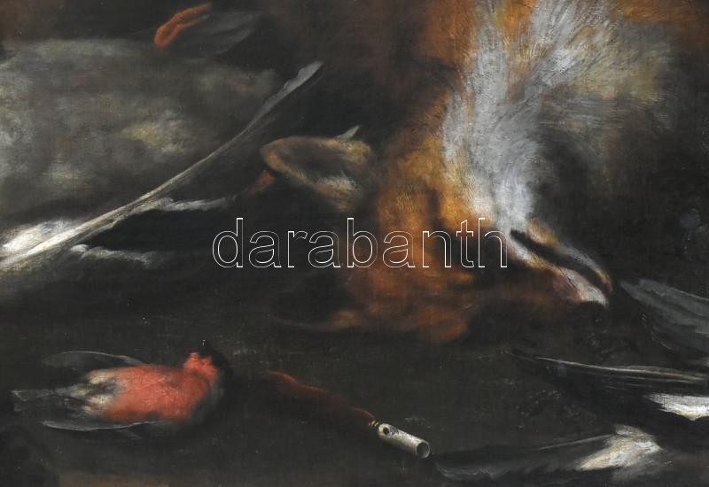 VÉDETT/NO EXPORT! XVIII. századi német festő, jelzés nélkül: Vadászcsendélet. Olaj, vászon. Dublírozott, restaurált, sérült. Proveniencia: BÁV 64. képaukció, 1984 szeptember, 108. tétel. 114x149 cm. Dekoratív, kissé sérült fakeretben. KIZÁRÓLAG SZEMÉLYES ÁTVÉTEL!/ 18th century German painter: Hunting still llife. Oil on canvas. Unsigned. Restored, damaged. Provenance: BÁV 64th auction, 1984 september, lot 108. 114x149 cm. Framed. VÉDETT/NO EXPORT! ONLY PERSONAL COLLECTION AT OUR OFFICE!