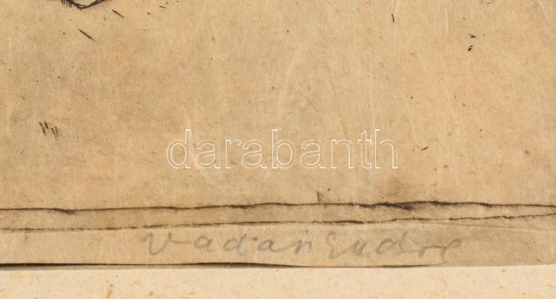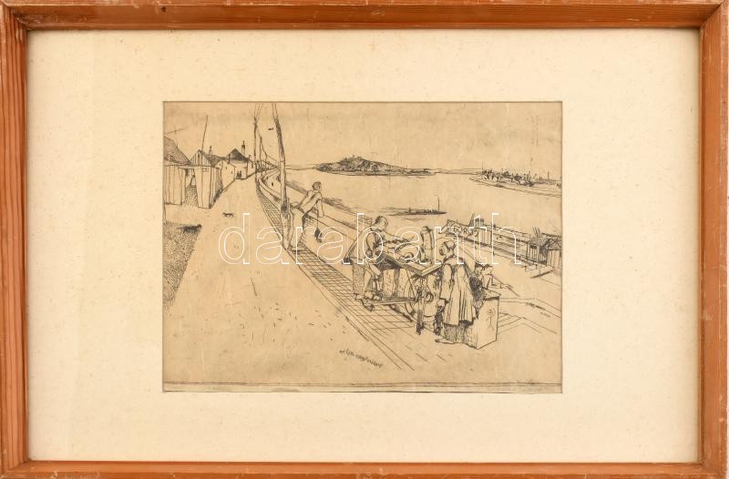 Description: Vadász Endre (1901-1944): Vízpart (cím nélkül). Rézkarc, papír, jelzett. 22x28,5 cm. Felületi törésnyomokkal. Üvegezett fakeretben. / Endre Vadász (1901-1944): Near the water. Etching on paper, signed. With minor surface damages. Framed. 22x28,5 cm