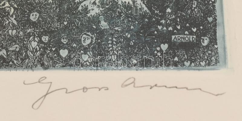 Description: Gross Arnold (1929-2015): Az öröm ünnepe. Színes rézkarc, papír. Jelzett. Próbanyomat próba jelzéssel. 28x31 cm. Üvegezett fém keretben. / etching on paper, signed, framed