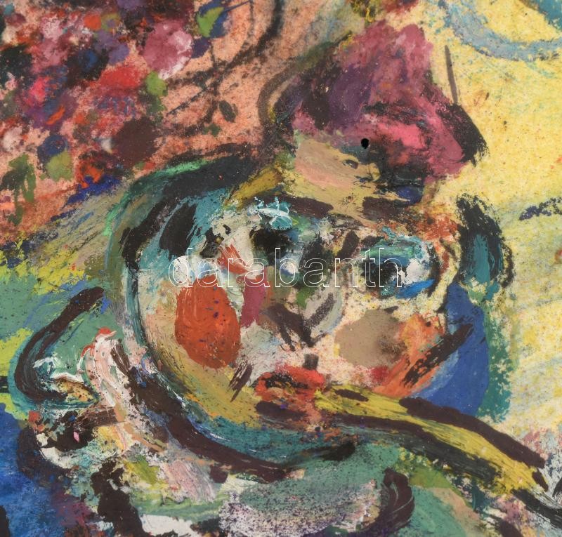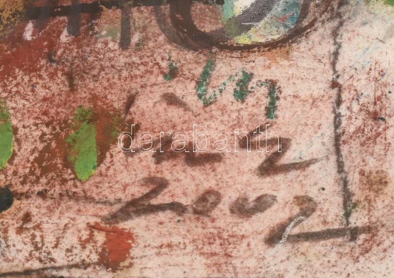 Tóth Ernő (1949- ): A nagy buborék. Vegyes technika, papír, jelzett. Üvegezett, kissé sérült fa keretben. Hátoldalán autográf felirattal. 70×50 cm