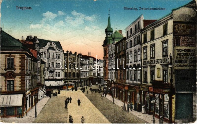 1916 Opava, Troppau; Oberring, Zwischenmärkten, Sodawasser Erzeugung, Eisenhandlung, Mieder, Hugo Haas / square, shops, tram (EK)