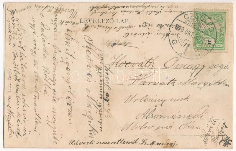 1910 Cegléd, Református templom. Üdvözlet, montázs a laktanya udvaráról levelet író katonával. Sárik Gyula 1178. (r)