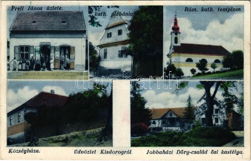 Description: 1939 Kisdorog, községháza, római katolikus templom és plébánia, Jobbaházi Dőry család ősi kastélya, Prell János üzlete. Mikussay Ozmán fényképész kiadása