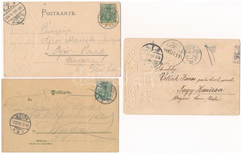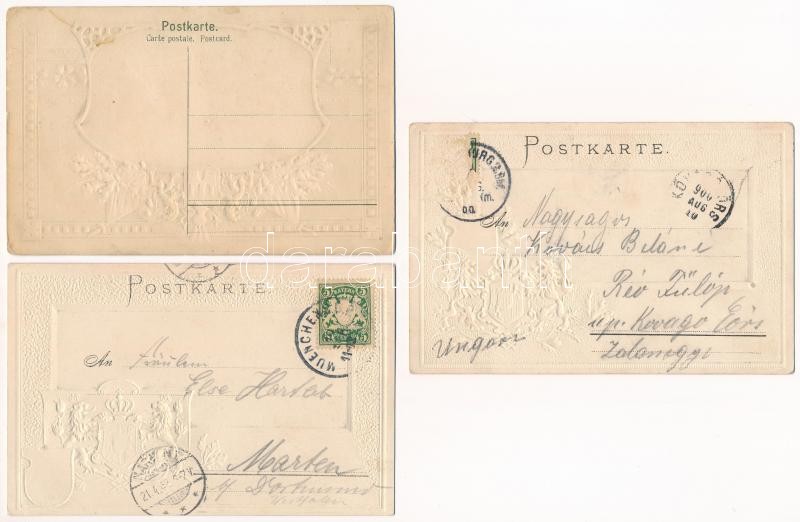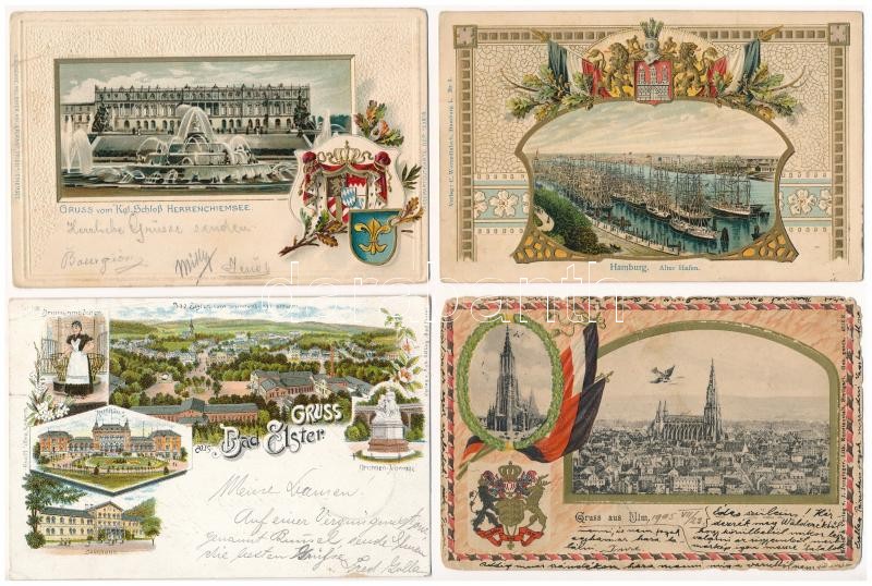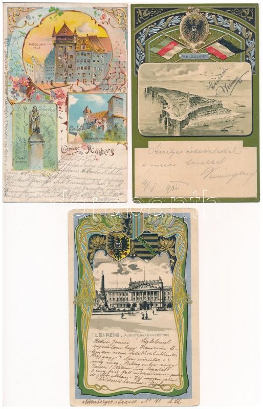 10 db RÉGI hosszú címzéses német szecessziós dombornyomott litho város képeslap vegyes minőségben / 10 pre-1905 German Art Nouveau, floral, embossed and litho town-view postcards in mixed quality: Bad Elster, Leipzig, Helgoland, Regensburg, Nürnberg, Hamburg, Müchen, Ulm, Herrenchiemse