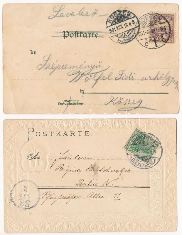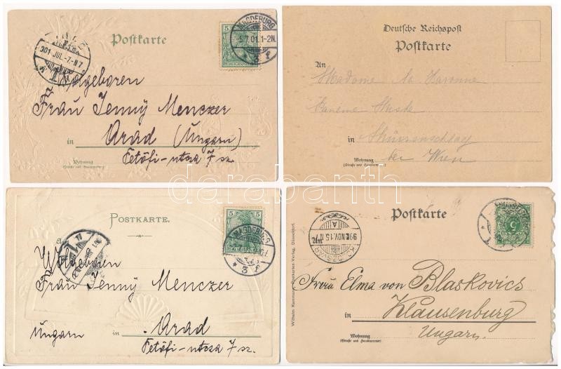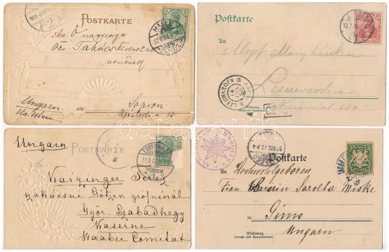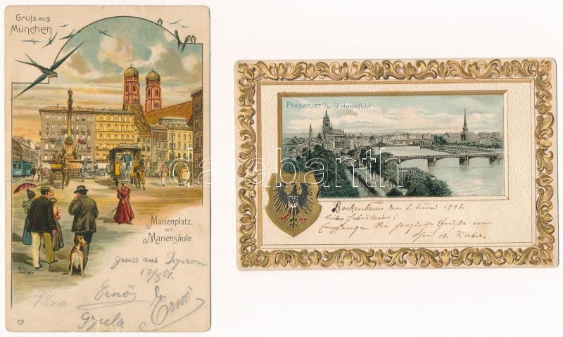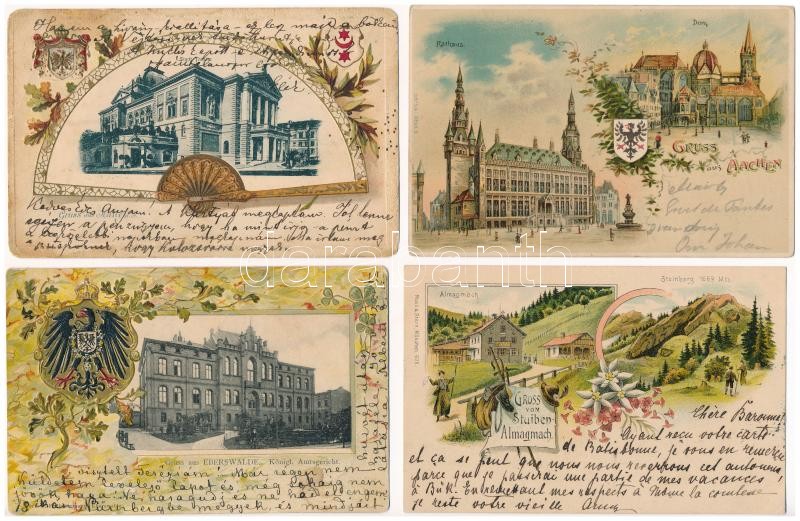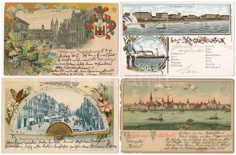 10 db RÉGI hosszú címzéses német szecessziós dombornyomott litho város képeslap vegyes minőségben / 10 pre-1905 German Art Nouveau, floral, embossed and litho town-view postcards in mixed quality: Halle, Eberswalde, Frankfurt, Düsseldorf, Warnemünde, München, Magdeburg, Almagmach, Aachen