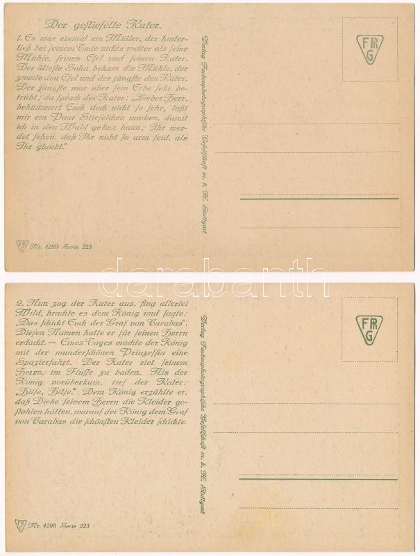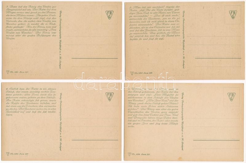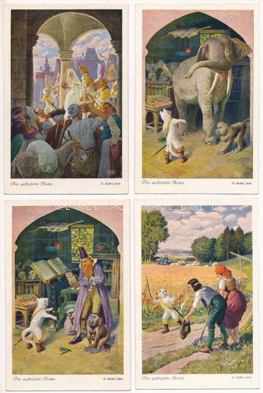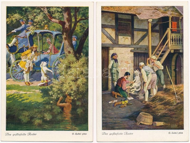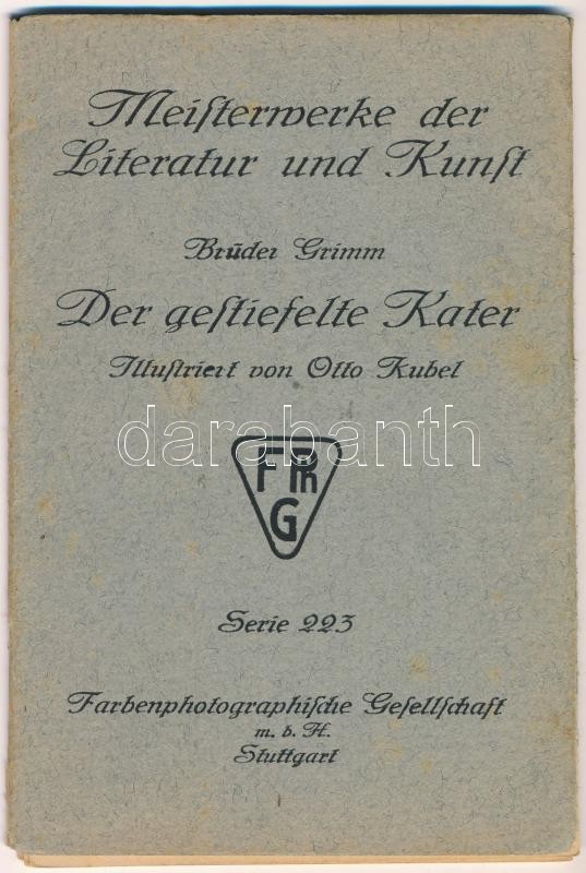 Meisterwerke der Literatur und Kunst. Brüder Grimm - Der gestiefelte Kater - Illustriert von Otto Kubel. Farbenphotographische Gesellschaft Serie 223 / CSIZMÁS KANDÚR - Képeslapsorozat 6 db régi képeslappal tokban / Puss in Boots - postcard series with 6 pre-1945 postcards in case