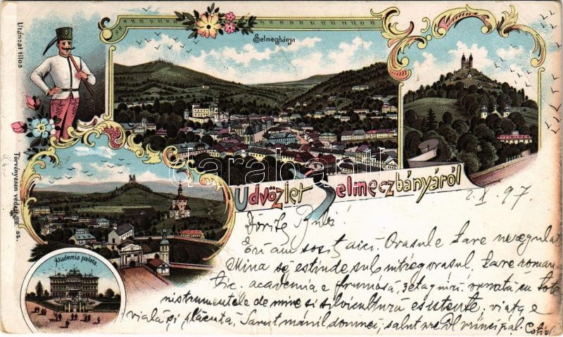 1897 (Vorläufer) Selmecbánya, Banská Stiavnica; látkép, Bányászati és Erdészeti Akadémia palotája, Hegybányai (Szélaknai) kapu, Piargi kapu, Leányvár, Kálvária, bányász / Piargská (Frauenbergská) brána, Novy zámok, Kalvária / general view, Mining and Forestry Academy palace, old city gate, calvary, castle, miner. 1950. Art Nouveau, floral, litho (EB)