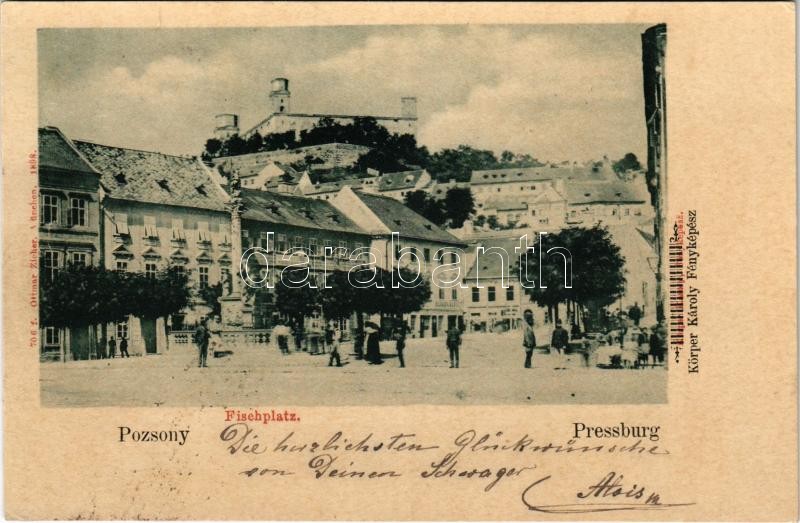 1898 (Vorläufer) Pozsony, Pressburg, Bratislava; Hal tér. Körper Károly fényképész / Fischplatz / square, shops