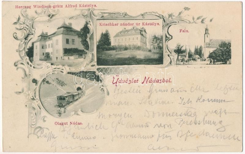 1902 Pozsonynádas, Nádas, Trstín; falu, templom, vasúti alagút vonattal, Herczeg Windisch-grätz Alfred és Krischker Nándor úr kastélya / castles, square, church, railway tunnel, train. Art Nouveau, floral