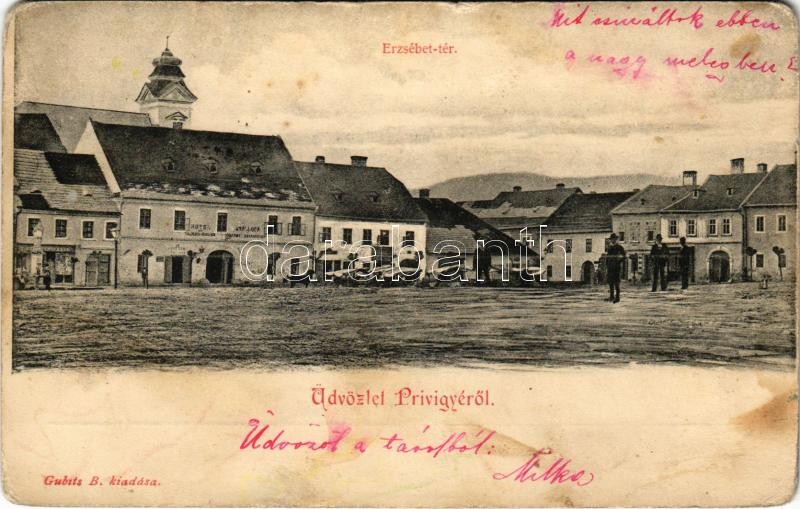 1905 Privigye, Prievidza; Erzsébet tér, piac, Szálloda az Arany Szarvashoz. Gubits B. kiadása / square, market, shops, hotel (Rb)