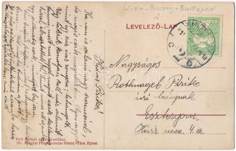 Description: 1913 Perbete, Pribeta; Izraelita templom (zsinagóga), óvoda és községháza. Feit Bernát kiadása / synagogue, kindergarten, town hall + "WIEN - POZSONY - BUDAPEST 2 C" vasúti mozgóposta bélyegző (fl)