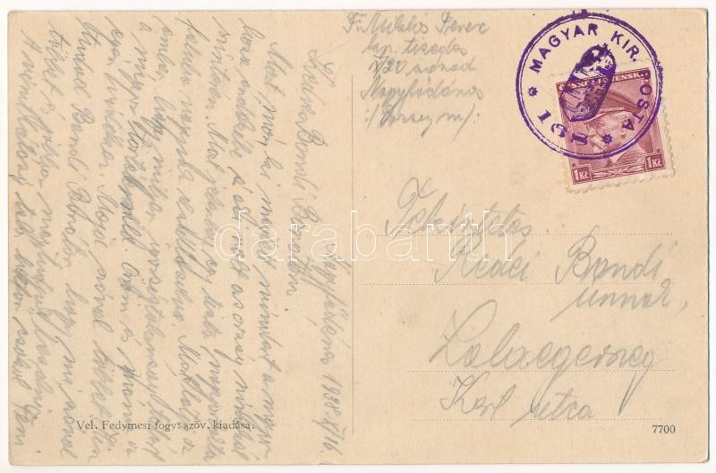 Description: 1938 Nagyfödémes, Velky Fedymes, Velké Úlany; Buda, Felszeg és Alszeg utca, Fogyasztási szövetkezet üzlete és saját kiadása / streets, cooperative shop + "MAGYAR KIR. POSTA 168"