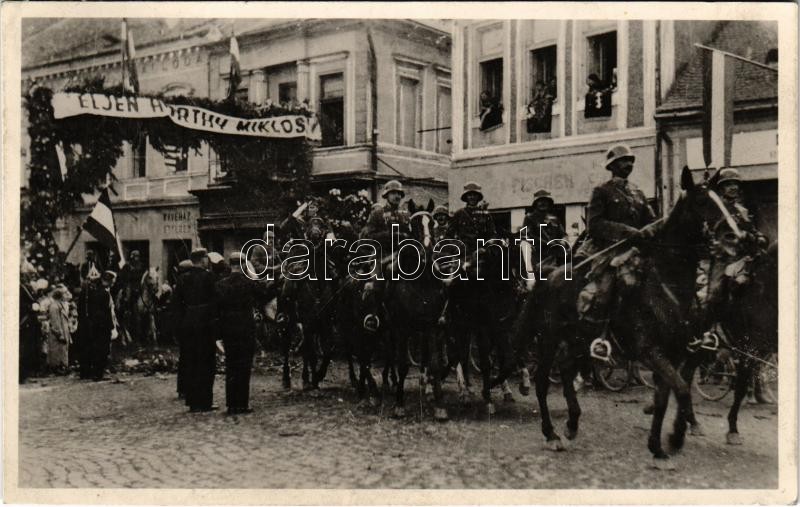 1938 Rimaszombat, Rimavska Sobota; bevonulás, díszkapu "Éljen Horthy Miklós" felirattal, Fischer üzlete, kávéház és étterem. Hátoldalon "Ami magyar, mindent vissza" magyar szívben / entry of the Hungarian troops, cafe and restaurant, shop, decorated gate. Hungarian irredenta sticker on the backside