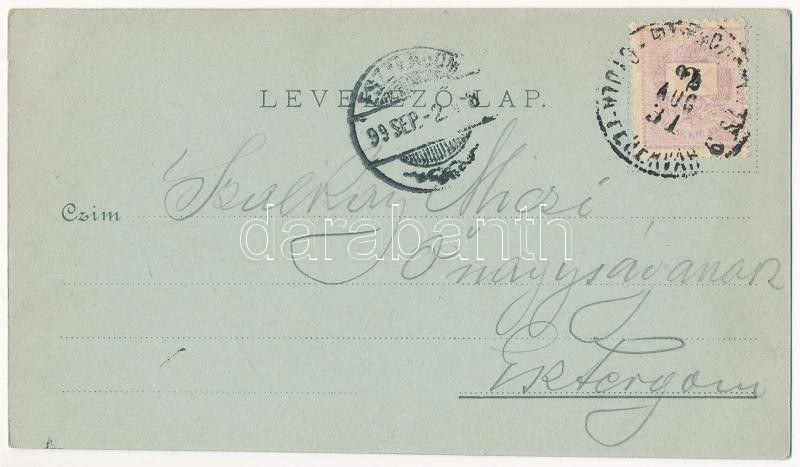 1899 (Vorläufer) Arad, Minorita templom, vár főkapuja, Maros-part, Lyceum, Arad-Csanádi egy. Vasutak palotája, lóvasút / Minorite church, castle gate, Mures riverside, grammar school, railway palace, horse-drawn tram. Art Nouveau, floral, litho