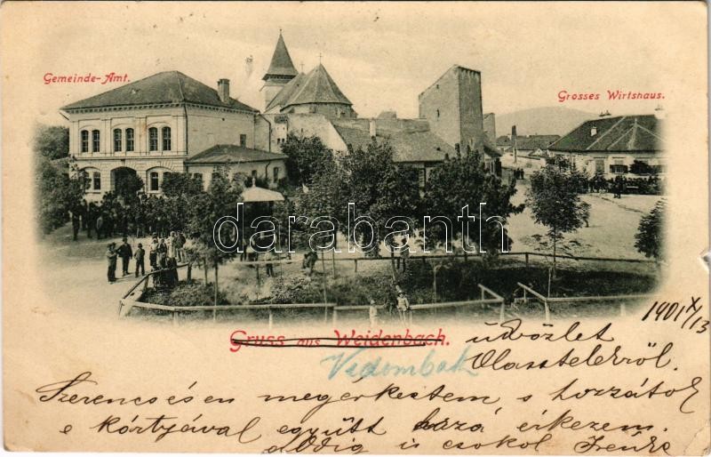 Description: 1901 Vidombák, Weidenbach, Ghimbav (Brassó); Gemeinde Amt, Grosses Wirtshaus / Vendéglő a Jó Szellemhez, városháza / restaurant, town hall (kis szakadás / small tear)