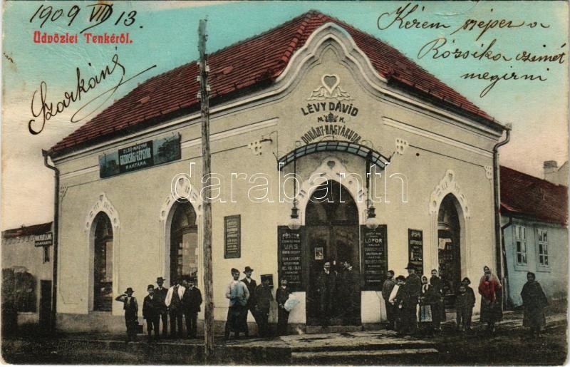 Description: 1909 Tenke, Tinca; Lévy Dávid M. K. dohány nagyáruda üzlete, Első Magyar gazdasági gépgyár raktára, Molnár Lajos szíjgyártó. Lévy Dávid saját kiadása / tobacco shop, machine factory depot (Rb)