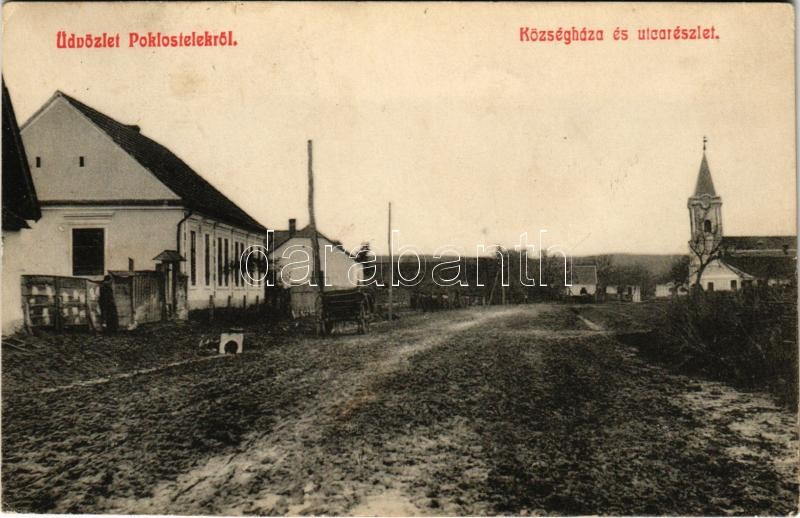 1910 Poklostelek, Poclusa de Barcau (Bihar); községháza, utca, templom / town hall, street, church + "POKLOSTELEK BIHAR VM. POSTAI ÜGYN" (EK)