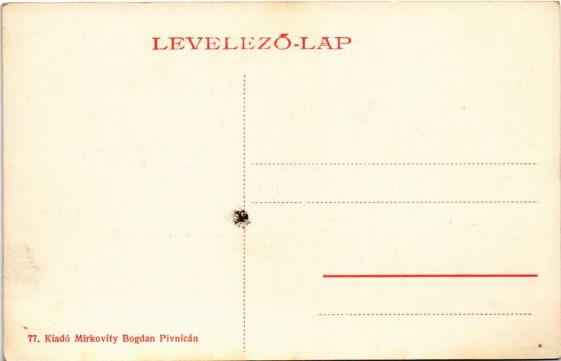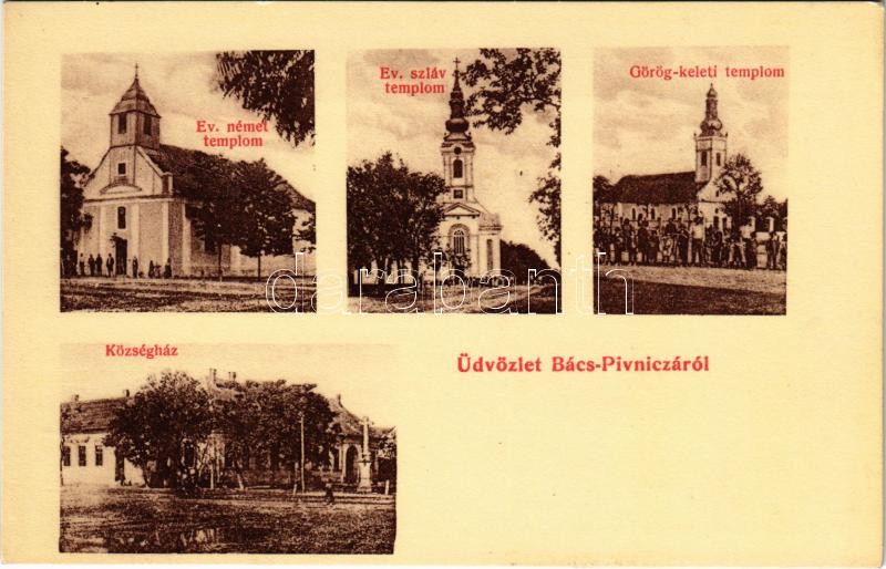 Description: Pincéd, Bács-Pivnica, Pivnice; Evangélikus német templom, Evangélikus szláv templom, Görögkeleti (ortodox) templom, községháza. Mirkovity Bogdan kiadása / Lutheran churches, Orthodox church, town hall