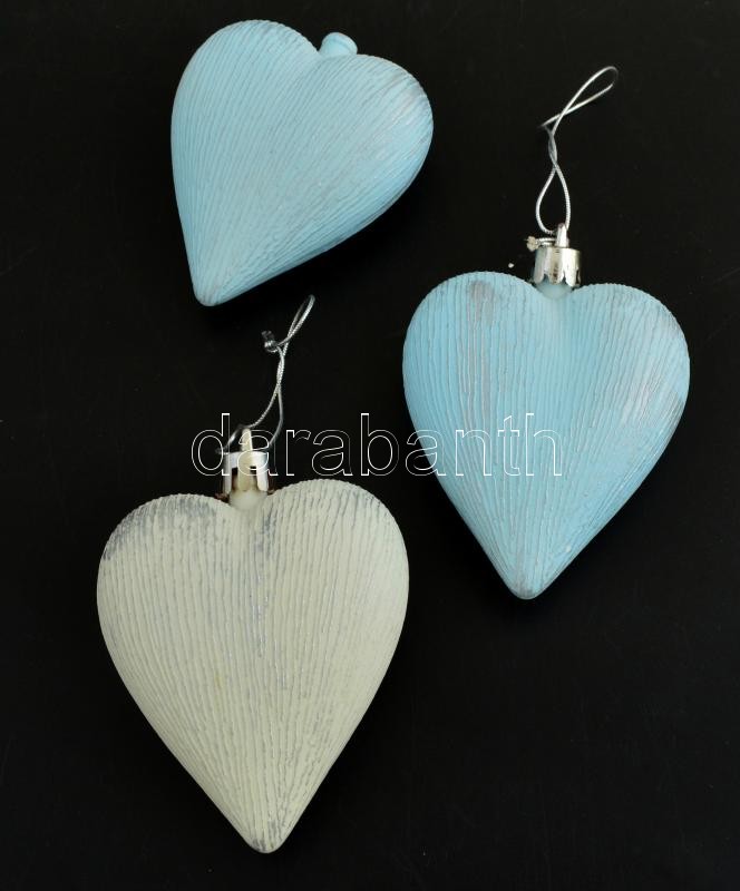 3 db szív alakú karácsonyfadísz, egyiken hiányzó akasztóval, 9x6,5 cm