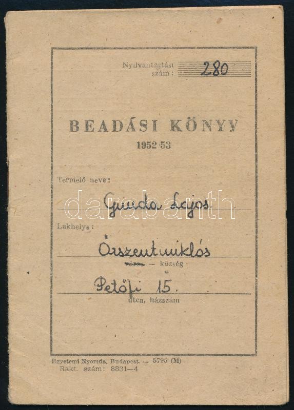 1952-1953 Őrszentmiklós, beadási könyvecske