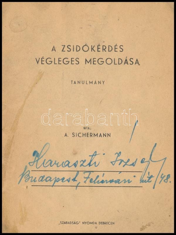 Description: 2 db könyv a "zsidókérdésről": Martinovich Sándor: A zsidókérdés. Pécs, 1918. Pius kollégium. 40p. Sérült, elvált papírborítóval. A. Sichermann: A zsidókérdés végleges megoldása. Bp., (1945) Szabadság nyomda. 32p. Sérült papírborítóval