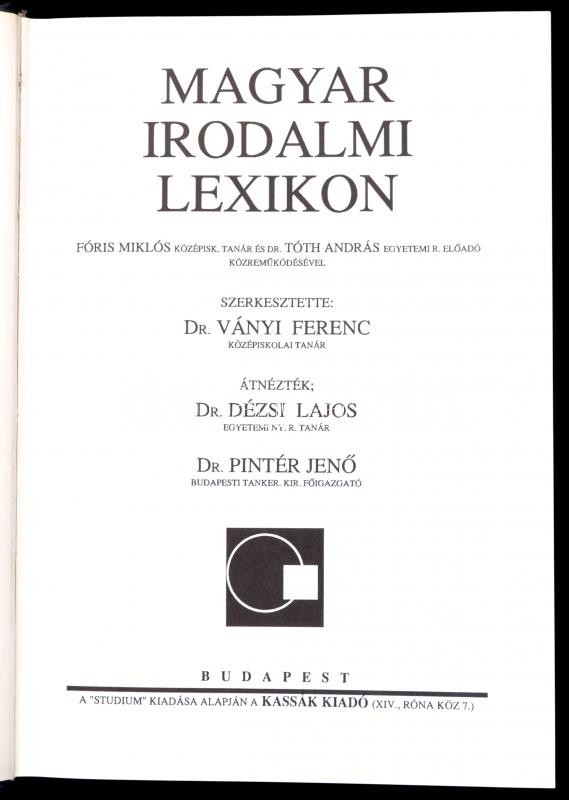 Magyar Irodalmi Lexikon. Szerk.: Dr. Ványi Ferenc. Bp., 1993, Kassák Kiadó. Kiadói aranyozott egészvászon-kötés.