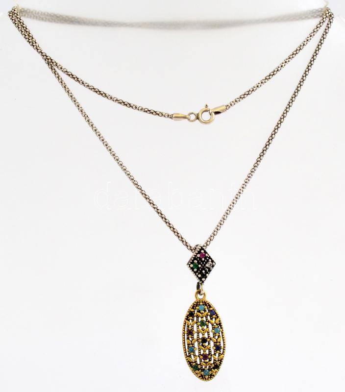 Ezüst(Ag) nyaklánc, színes kövekkel díszített medállal, jelzett, h: 50...