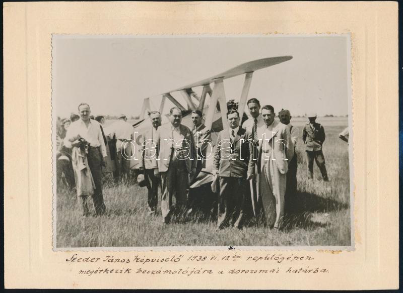 Description: 1938 vitéz dr. Szeder János országgyűlési képviselő, egyben a MOVE elnöke repülőgépen megérkezik beszámolójára a dorozsmai határba, feliratozott fotó, kartonra kasírozva, szép állapotban, 13×17 cm