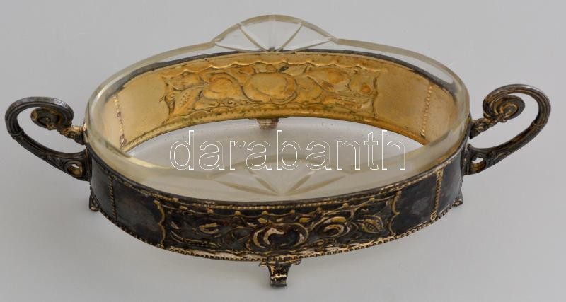 Üveg kínáló, alpakka lábas tartóban, kopottas állapotban, 15x7,5 cm
