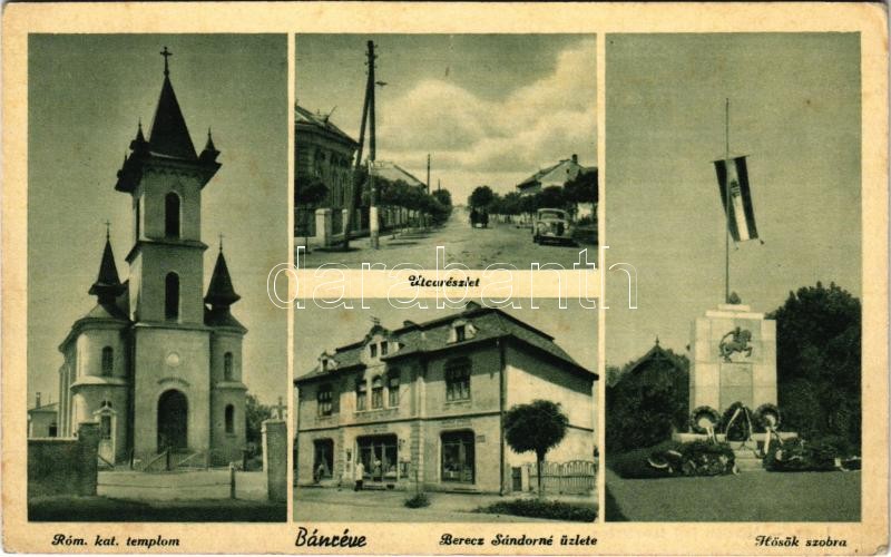 Bánréve, utca, automobil, Országzászló, Hősök szobra, emlékmű, Római katolikus templom, Berecz Sándorné üzlete (EK)