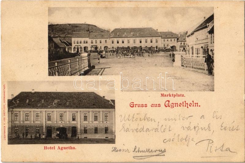 1901 Szentágota, Agnetheln, Agnita; Marktplatz, Hotel Agnetha / Piac tér, piaci árusok, üzletek, Agnetha szálloda. Lichtdruck v. Jos. Drotleff / market square, market vendors, shops, hotel (fl)