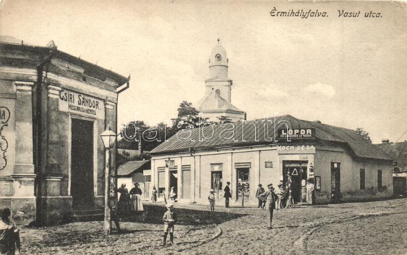 Érmihályfalva, Valea Lui Mihai; Vasút utca, Csiri Sándor mészáros és hentes és Koch Géza üzlete / street view with shops (ragasztónyom / gluemark)