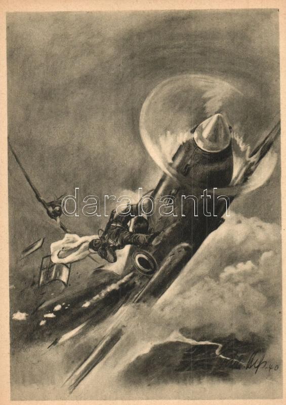 Kampf Jäger gegen Jäger. Eine "Spitfire" wird von einer deutschen Me 109 (Messerschmitt Bf 109) brennend abgeschossen / WWII Supermarine Spitfire, British fighter aircraft gets destroyed by a Me 109, German Luftwaffe fighter aircraft. s: R. Hess