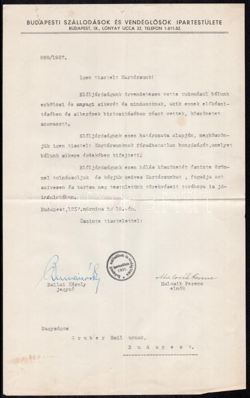 1937 Budapesti Szállodások és Vendéglősök Ipartestületének gépelt kösz... https://www.darabanth.com/en/382-Online-auction/382.0/Art-and-other-collectibles/Historical-documents-manuscripts~500018/1937-Budapesti-Szallodasok-es-Vendeglosok-Ipartestuletenek-gepelt-koszono-levele-Gruber-~II2275124