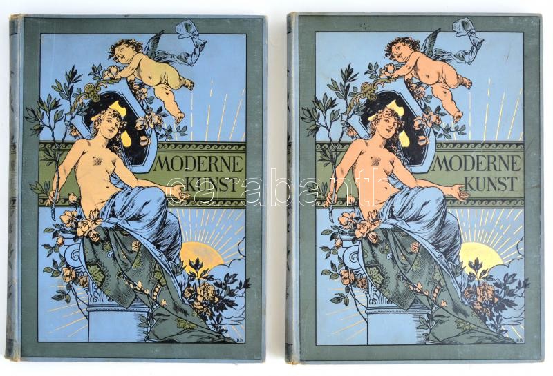 Description: Moderne Kunst in Meister-Holzschnitten. Nach Gemalden und Sculpturen Berühmter Meister Der Gegenwart. XIX. Band. Szöveges és képkötet. Berlin, é.n., Rich. Bong. Német nyelven. Egész és kétoldalas illusztrációkkal. Kiadói festett egészvászon borítókkal, kopott borítókkal, laza fűzéssel, a képkötetben egy lapot körbevágtak.