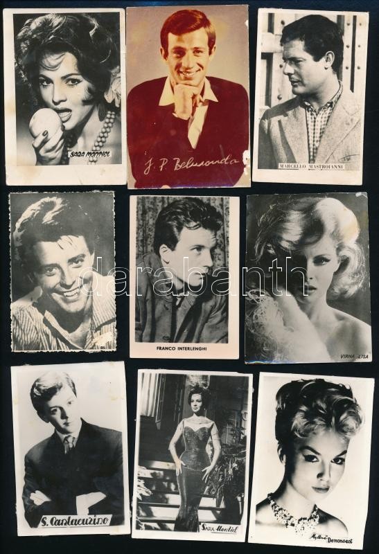 Színészeket ábrázoló kisméretű fotók (Belmondo, Virna Lisi, Gassmann, stb.), hátoldalon ragasztásnyommal, 20 db, vegyes méretben