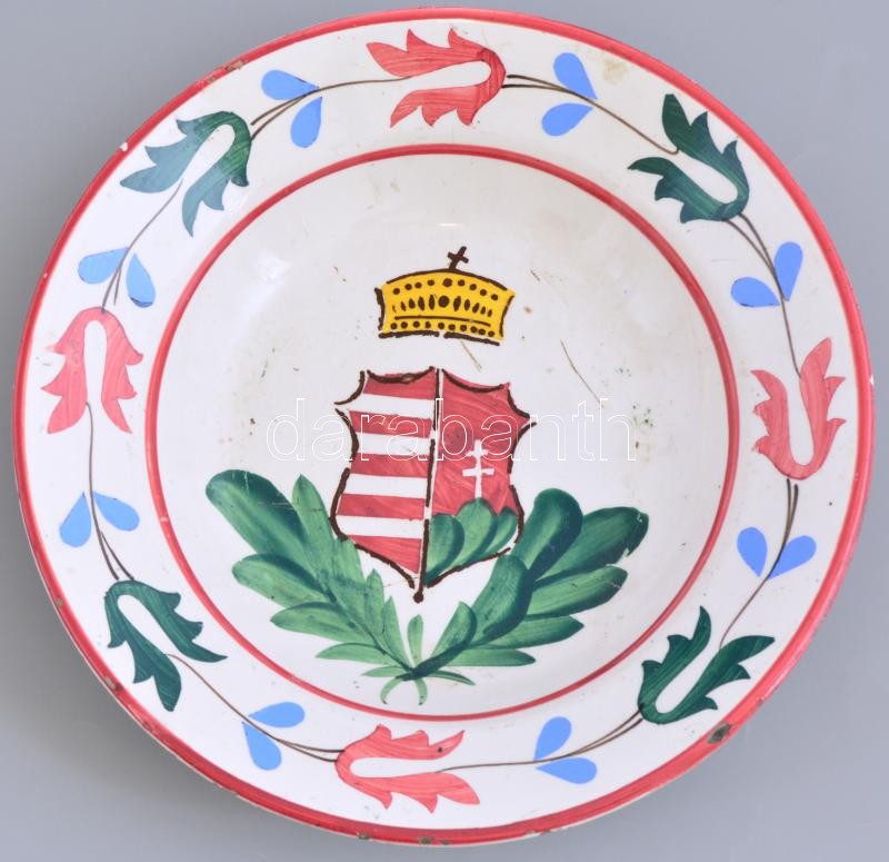Hollóházi régi címeres kerámia fali tányér, kézzel festett, jelzett, k...