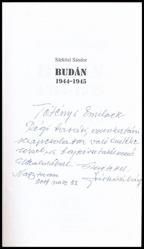 Sárközi Sándor: Budán 1944-1945. Drámai költemény. Bp., 2004, Kornétás... https://www.darabanth.com/en/384-Online-auction/384.0/Books/Books-Military~1000005/Sarkozi-Sandor-Budan-1944-1945-Dramai-koltemeny-Bp-2004-Kornetas-DEDIKALT-Fekete-f~II2289119