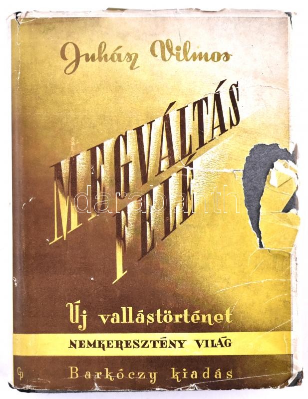 Juhász Vilmos: Megváltás felé. Új vallástörténet. A nemkeresztény világ. Bp., 1943, Barkóczy, (Hellas-ny.), XVI+462 p.+16 (kétoldalas fekete-fehér képtáblák) t. K Kiadói félvászon-kötésben, kiadói papír védőborítóban, a papírborító szakadt, kissé foltos, az elülső részén sérüléssel, hiánnyal.