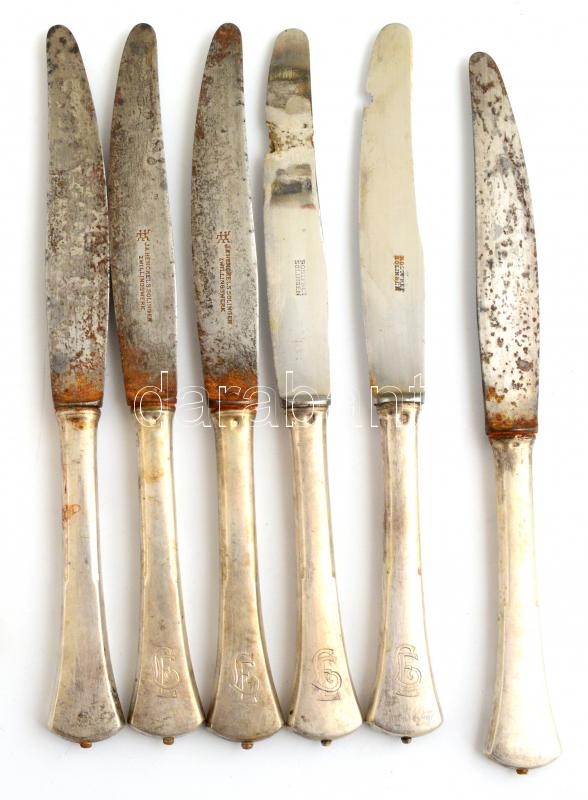 Ezüst (Ag) evőeszköz készlet. 6 személyes, komplett, 42 darabos. Jelzett, halvány monogrammal. XIX. sz. vége, magyar. Nettó 1474 g + a kések