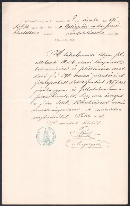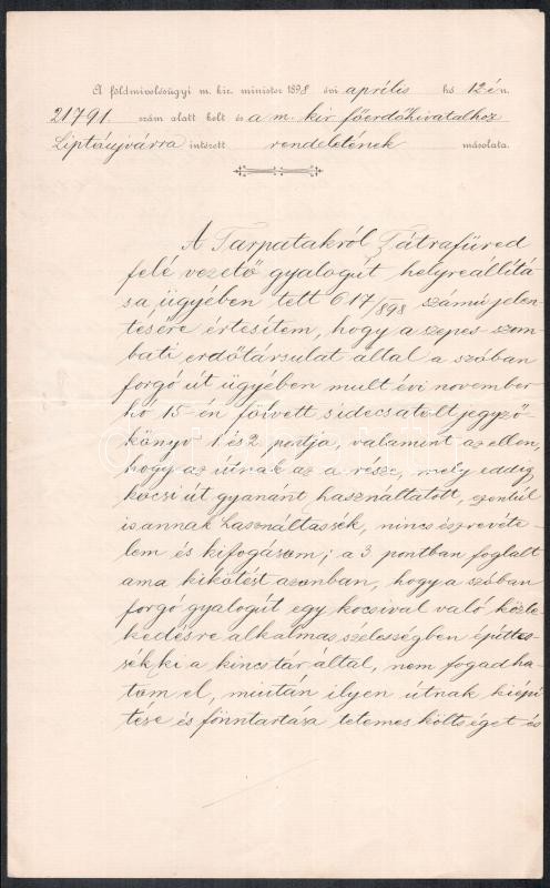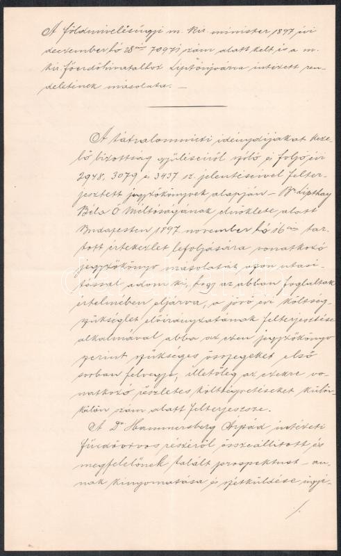 Description: 1895-1899 Tátralomnici vonatkozású iratok gyűjteménye: báró Lipthay Béla birtokaként funkcionáló terület fejlesztése tárgyában született minisztériumi válaszlevelek. Lámpatelepítés, női medence szobává alakítása, költségvetések 9 db irat.
