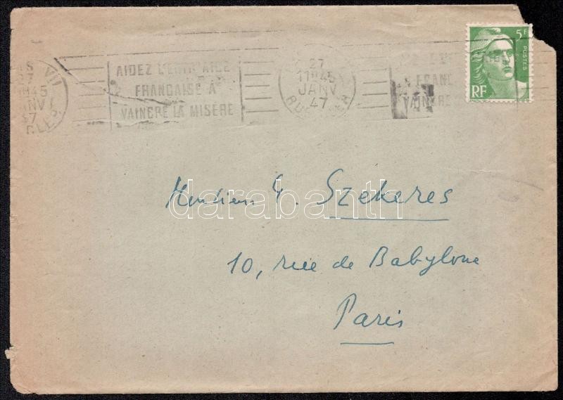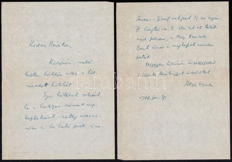 1947 Illyés Gyula (1902-1983) költő, író saját kézzel írt sorai Szekeres György (1914-1973) újságíró, műfordító, (később az Európa Kiadó főszerkesztője) részére, benne köszönő sorokkal a visszaadott kritikáért, valamint Cs. Szabó László (1905-1984) író pesti címével, saját kezű aláírásával, másfél beírt oldal, borítékkal, dátumozva (1947. jan. 25.)