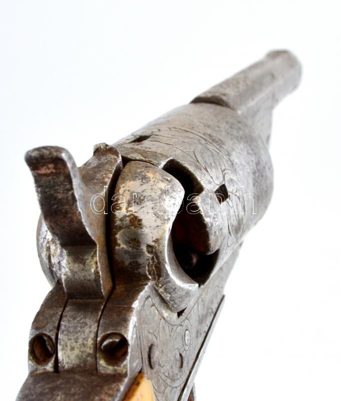 cca 1890-1914 Jules Kaufmann revolver, Liége-i belga fegyvergyáros Colt Pocket Navy másolata, jelzett (forgótáron: Korona/ Korona alatt J K, csövön: Korona alatt R csillag C), gravírozott, sérült csontmarkolattal, hatástalanított, hiánnyal, 23x11 cm, 694 gr.