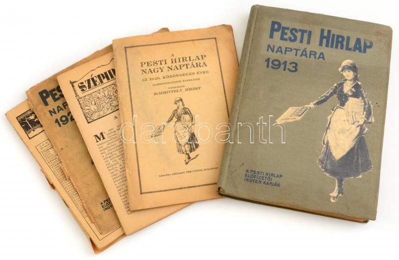 1913 Pesti Hírlap naptára az 1913. évre. 23. évf. Bp., Légrády-ny. Gazdag fekete-fehér képanyaggal, érdekes írásokkal, korabeli reklámokkal. Benne a stockholmi olimpiáról szóló írással, és fotókkal is. Kiadói kissé kopott, kissé foltos egészvászon-kötésben.+1922 Pest Hírlap naptára, rossz állapotban, hiányos. + 1926 Pesti Hirlap 1926. évi nagy naptára, naptára, rossz állapotban, hiányos.