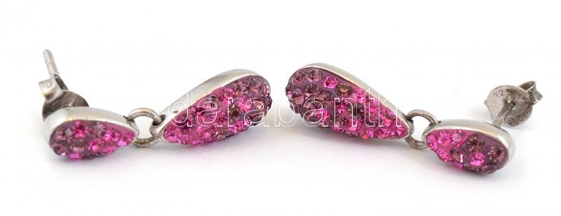 Ezüst(Ag) ciklámenszínű strasszokkal díszített fülbevalópár, jelzett, h: 2,5 cm, bruttó: 3,6 g