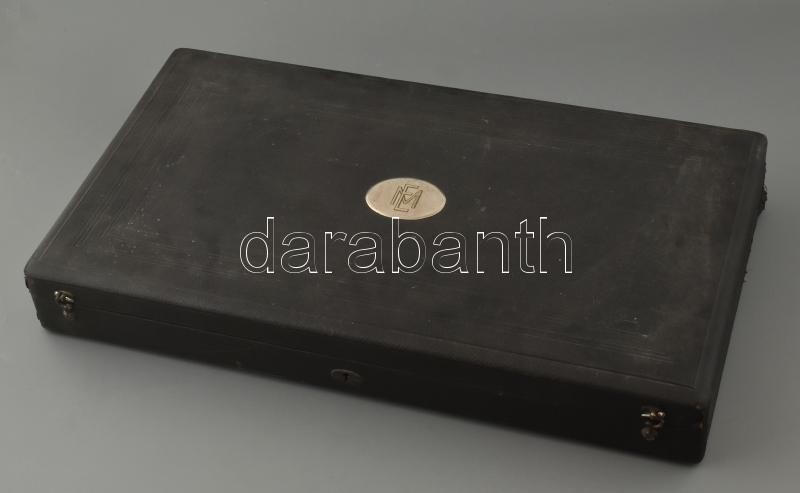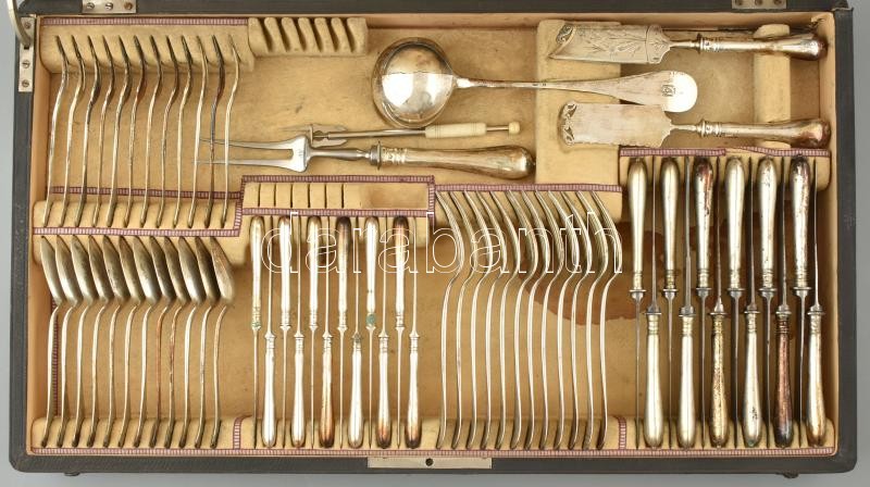 Description: XX. sz eleje: Paar János 12 személyes ezüst (Ag) evőeszköz készlet. 65 darabos. Mesterjegyes, jelzett .szép állapotban, eredeti dobozában. Nettó 1875 g + ezüst nyelű kések, húsvilla, pecsenyetű. Doboz sérült, rajta monogramos fém plakett. / Silver cuttlery set for 12 person.