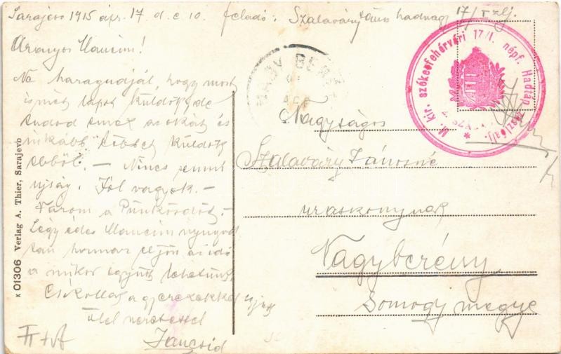 1915 Sarajevo, Bosnische Strassenbild / Bosnian street + "M. Kir. székesfehérvári17/I. népf. hadtáp zászlóalj 2. szakasz" (EK)