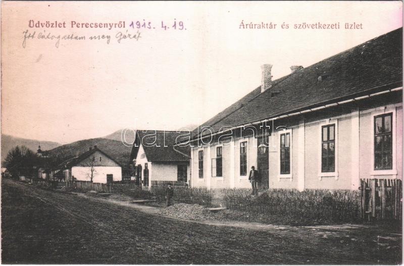 1915 Perecseny, Perechyn, Perecin; Áruraktár és szövetkezeti üzlet / warehouse and cooperative shop