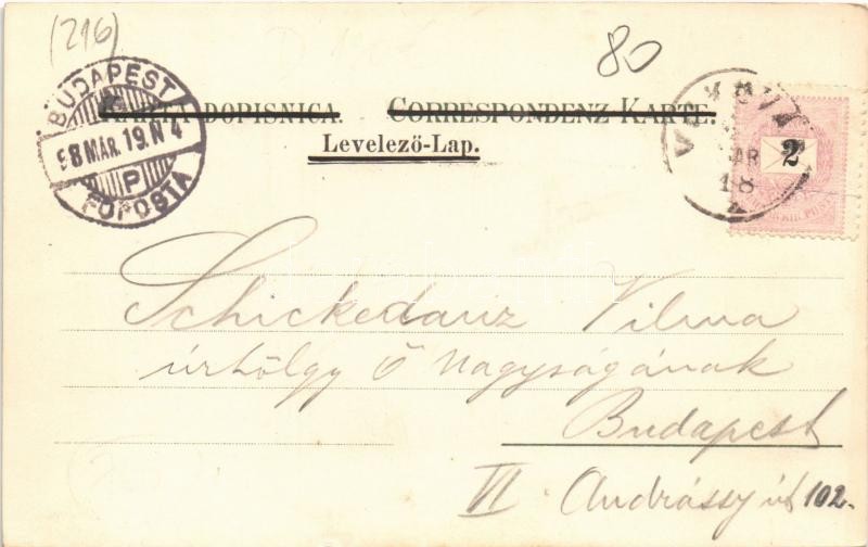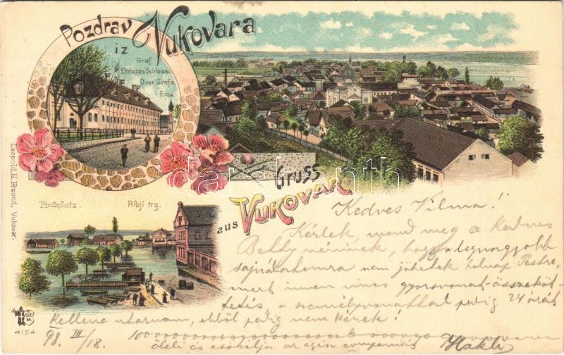 1898 Vukovár, Vukovar; Graf Eltzsches Schloss, Fischplatz / Dvor Grofa Eltza, Ribji trg / Eltz kastély, Hal tér, látkép, zsinagóga. Leopold H. Freund kiadása / castle, square, fishing boats, general view with synagogue. Art Nouveau, floral, litho