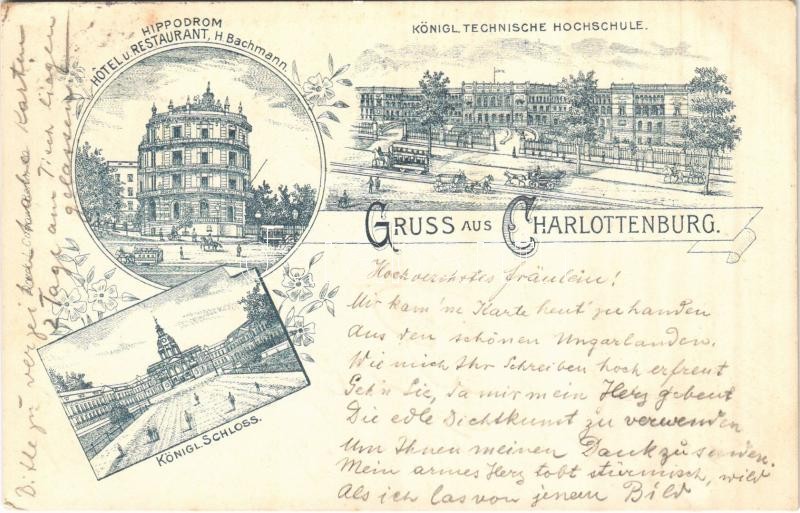 Description: Berlin, Charlottenburg, Königl. Technische Hochschule. Königl. Schloss, Hippodrom Hotel u. Restaurant H. Bachmann / school, castle, hotel and restaurant. Art Nouveau, floral (Rb)